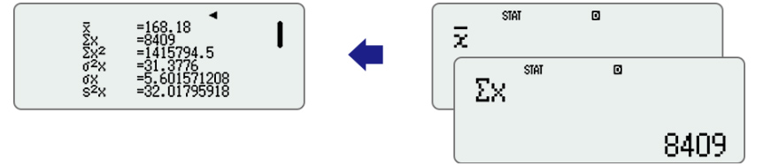 As variáveis e os resultados dos cálculos estatísticos armazenados na memória podem ser exibidos em listas. Não há necessidade de registar e confirmar os valores individualmente como com os modelos anteriores.